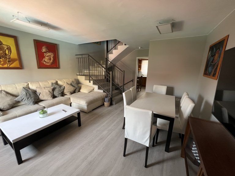 Nuestra acogedora casa adosada de tres pisos ha sido diseñada pensando en ofrecer un espacio cómodo y funcional donde su familia se sienta como en casa. En el primer piso, una cocina completamente equipada y un amplio salón crean el ambiente perfecto para compartir momentos en familia. Además, cuenta con un baño completo con plato de ducha.
